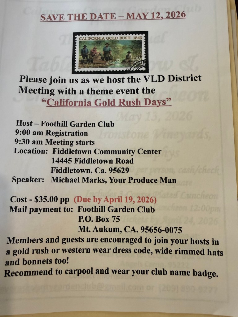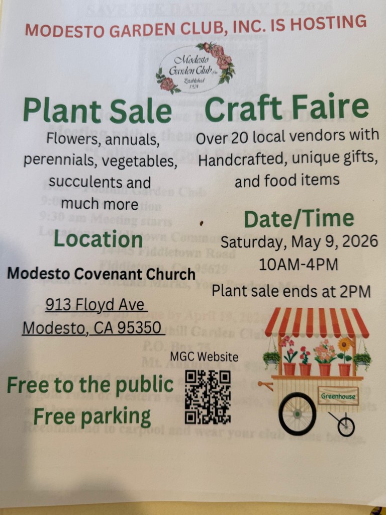 AnnouncementInteresting Nearby Events – April April 7, 2026April 7, 2026 Escalon Farmington Community Garden Club As announced at the February 2026 meeting.